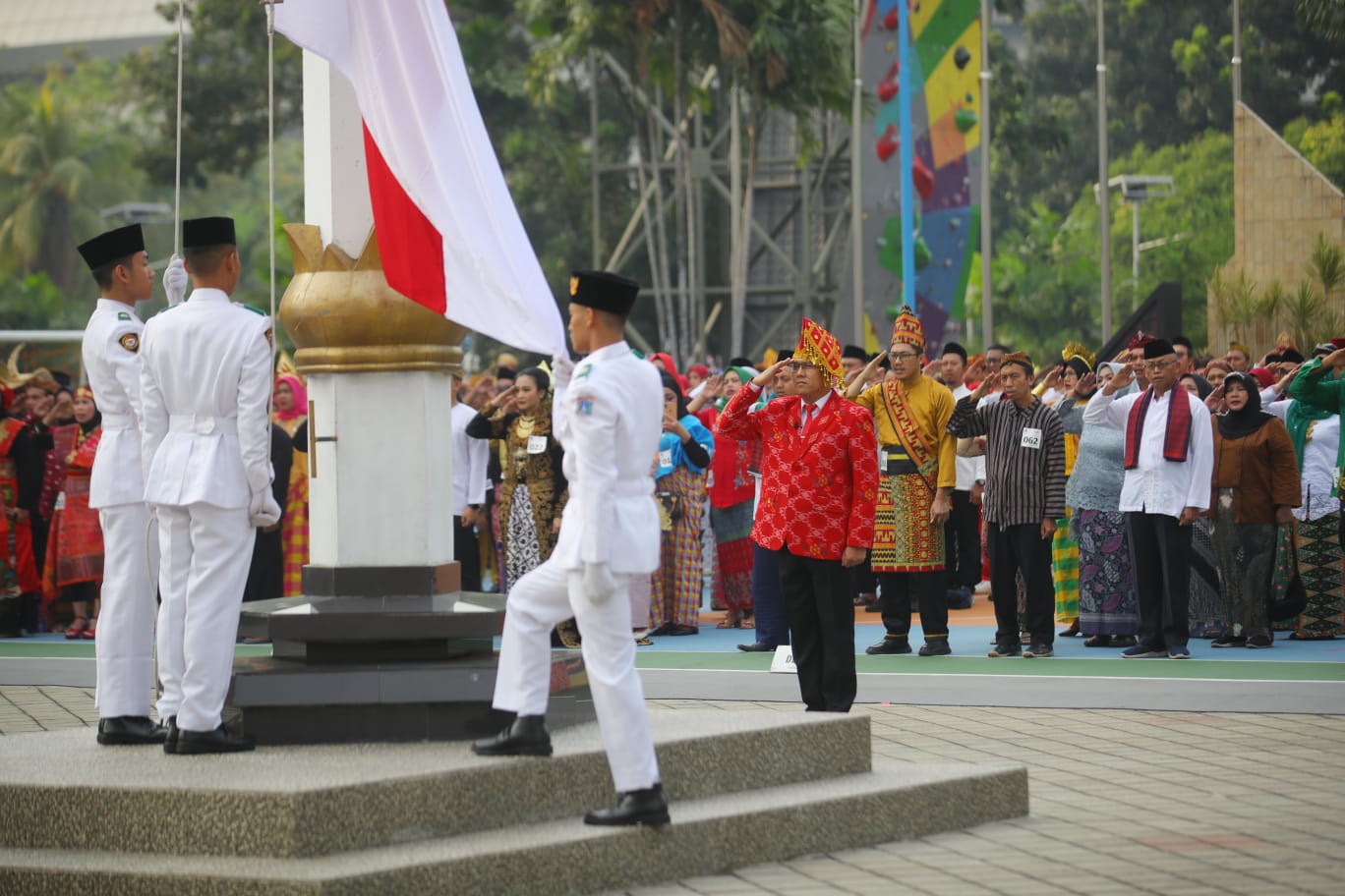 Jakarta: Kementerian Pemuda dan Olahraga Republik Indonesia (Kemenpora RI) melaksanakan Upacara Bendera Peringatan Hari Ulang Tahun (HUT) Kemerdekaan ke-79 Republik Indonesia di Halaman Kantor Kemenpora, Senayan, Jakarta, Sabtu (17/8) pagi. Upacara ini diikuti seluruh pejabat eselon dan para pegawai yang mengenakan baju adat dari berbagai daerah di Indonesia.