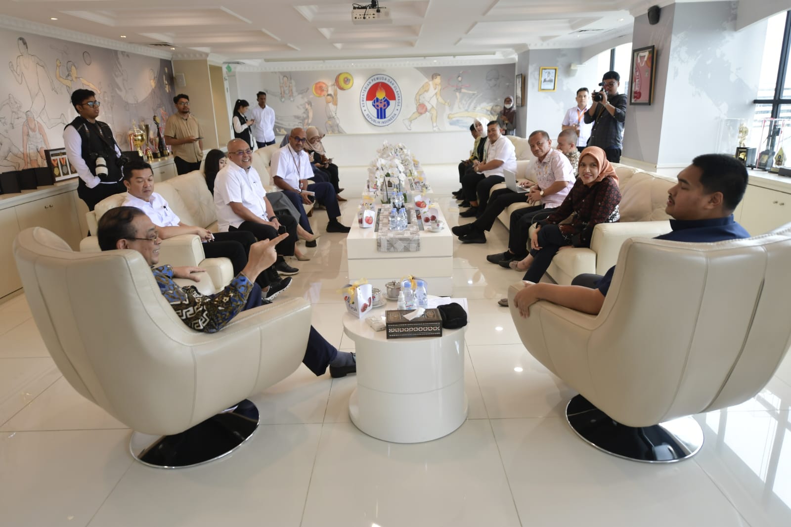 Jakarta: Menteri Pemuda dan Olahraga (Menpora) RI Dito Ariotedjo menerima visitasi Komisioner Komisi Informasi Pusat (KIP) di Graha Kemenpora, Jalan Gerbang Pemuda Nomor 3, Senayan, Kamis (28/11/2024). Visitasi ini terkait monitoring dan evaluasi (monev) keterbukaan informasi publik di Kemenpora RI.