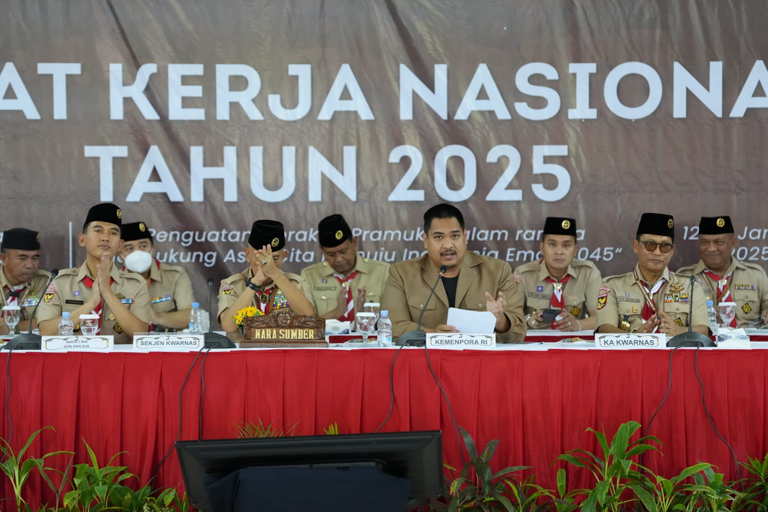 Turut hadir dalam Rakernas Gerakan Pramuka Tahun 2025 ini, Ketua Kwarnas Budi Waseso, Staf Ahli Mendikdasmen Bidang Manajemen Talenta Mariman Darto, Deputi Bidang Pemberdayaan Pemuda Asrorun Ni’am Sholeh, Asdep Organisasi Kepemudaan dan Kepramukaan Amar Ahmad.
