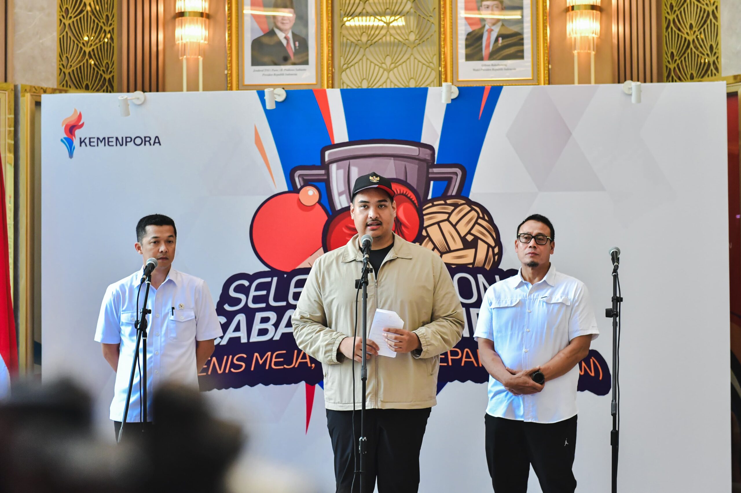 “Hari ini saya mengumumkan seleksi nasional tiga cabang olahraga yang akan dilakukan oleh Kemenpora. Kita membuka seleknas yang bisa diikuti seluruh atlet Indonesia dari cabor tenis meja, sepak takraw dan tinju,” kata Menpora Dito.