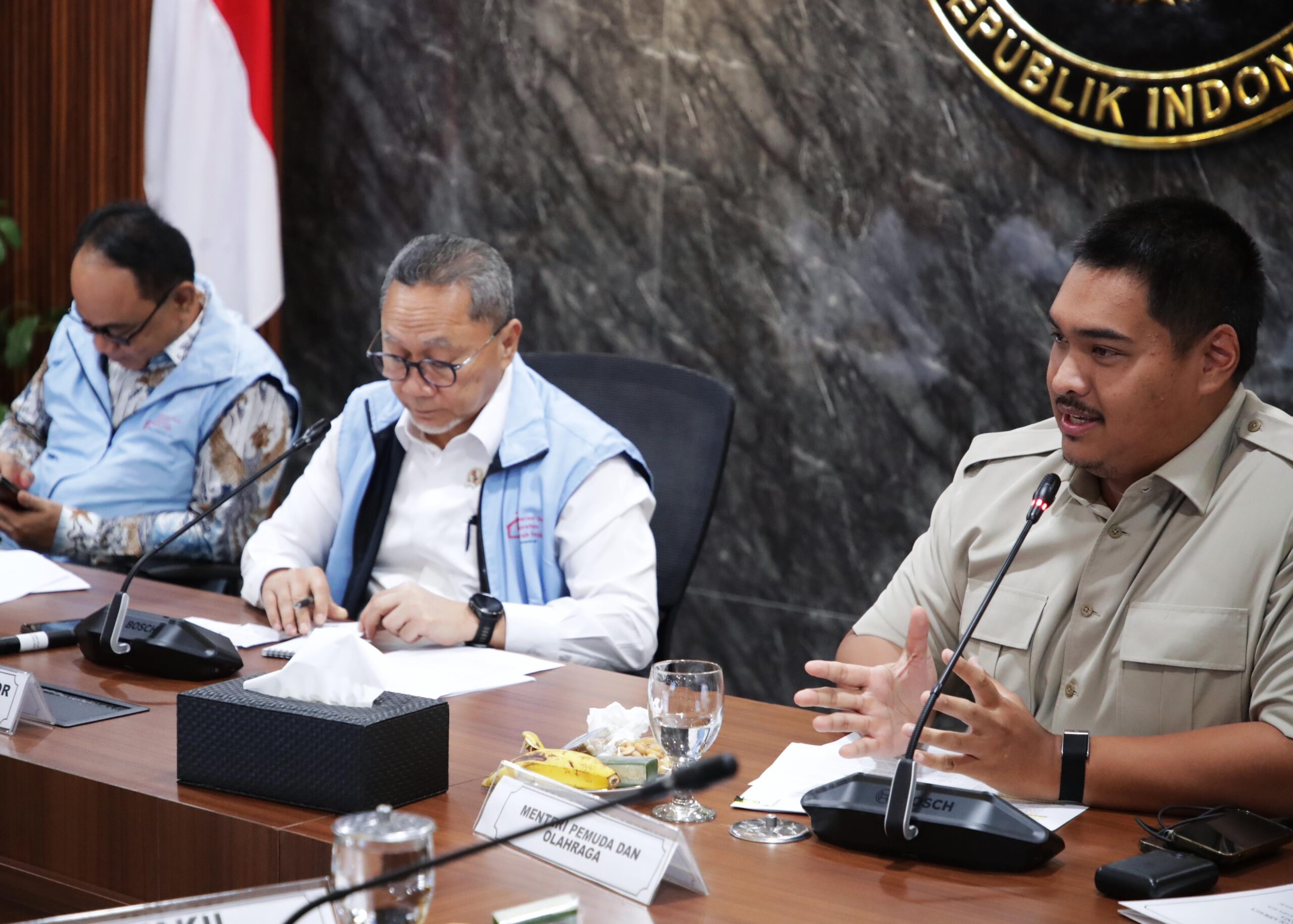 Jakarta: Menteri Pemuda dan Olahraga Republik Indonesia (Menpora RI) Dito Ariotedjo, dengan Menteri Koperasi Budi Arie Setiadi menghadiri Rapat Koordinasi Tingkat Menteri yang dipimpin Menteri Koordinator Bidang Pangan Zulkifli Hasan di Ruang Rapat Utama, rakor ini membahas tentang operasionalisasi dan pengembangan koperasi Desa/Kelurahan Merah Putih (KDKMP) ini, Menpora Dito tenegaskan sangat siap mendukung keterlibatan pemuda untuk Percepatan Pembentukan Koperasi Desa/Kelurahan Merah Putih., Kemenko Bidang Pangan, Graha Mandiri, Thamrin, Jakarta Pusat, Kamis (4/9).
