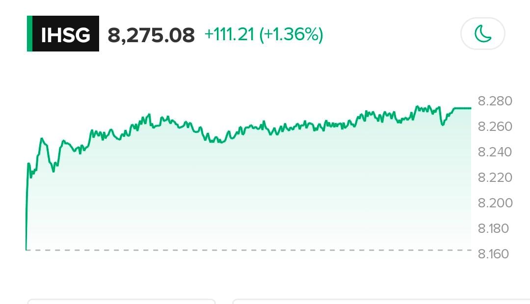 Jakarta — Indeks Harga Saham Gabungan (IHSG) mengawali pekan ini dengan penguatan signifikan sebesar 1,36 persen atau naik 111,21 poin, menutup perdagangan di level 8.275,08 pada Senin (3/11). Pergerakan positif ini menunjukkan meningkatnya optimisme pelaku pasar terhadap stabilitas ekonomi nasional menjelang akhir tahun.